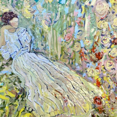 ‘Softly’ is a large oil painting on canvas, typical of Francesca’s large canvases it focuses on figure and abstraction to reveal a woodland scene. In the woodland a figure may be seen who is contemplative, hidden within the landscape and revealed through large loose brushstrokes. The green and blue tones are uplifted by a lemon yellow hue that signifies the dappled light as it comes through the trees and the peach tones in the foreground give a sense of warmth.
