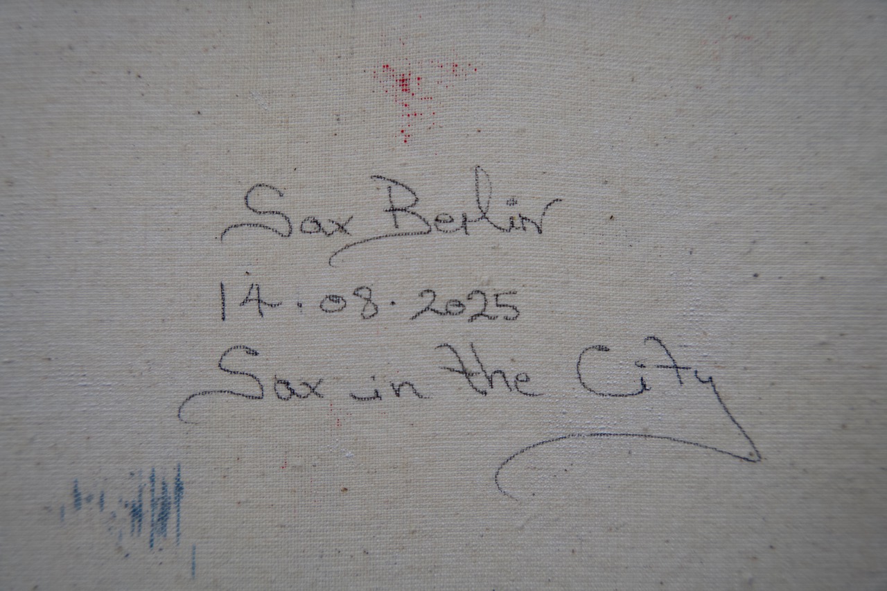 In his Neo-Expressionist paintings Berlin creates memories of dark and dangerous days in New York and the vibrant anarchistic time of Basquiat, Haring and Warhol. Sax in The City harks back to his own time in New York on the streets with these icons of modern art when graffiti was illegal and the artists were hunted out by the police. Now considered mainstream and accepted as the art form it is Berlin offers an edgy portrayal of the characters of that era and pays his own homage to his times as part of the scene.