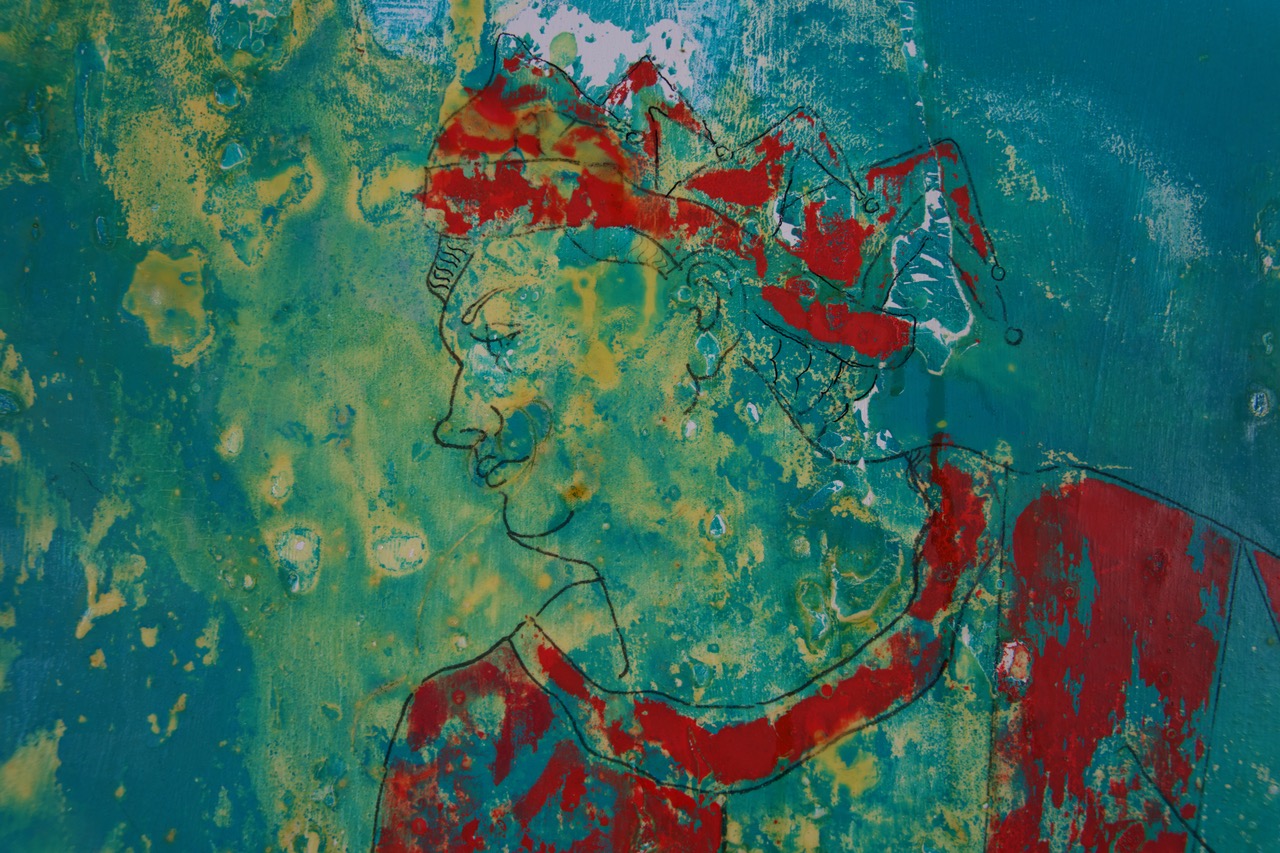 A figure floating in a swirling atmosphere like a space traveller looking down at our planet. This piece is all about trying to rise above the chaos and foment in the world and becoming transcendent. Berlin is a believer in the power of people to bring about good and within this painting is a definite feel of powerful forces at work.