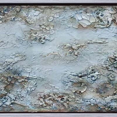 world is shifting beneath perception. Cracks and veils of paint suggest memory,fragmentation, and the tension betweenwhat is seen and what is felt. The work