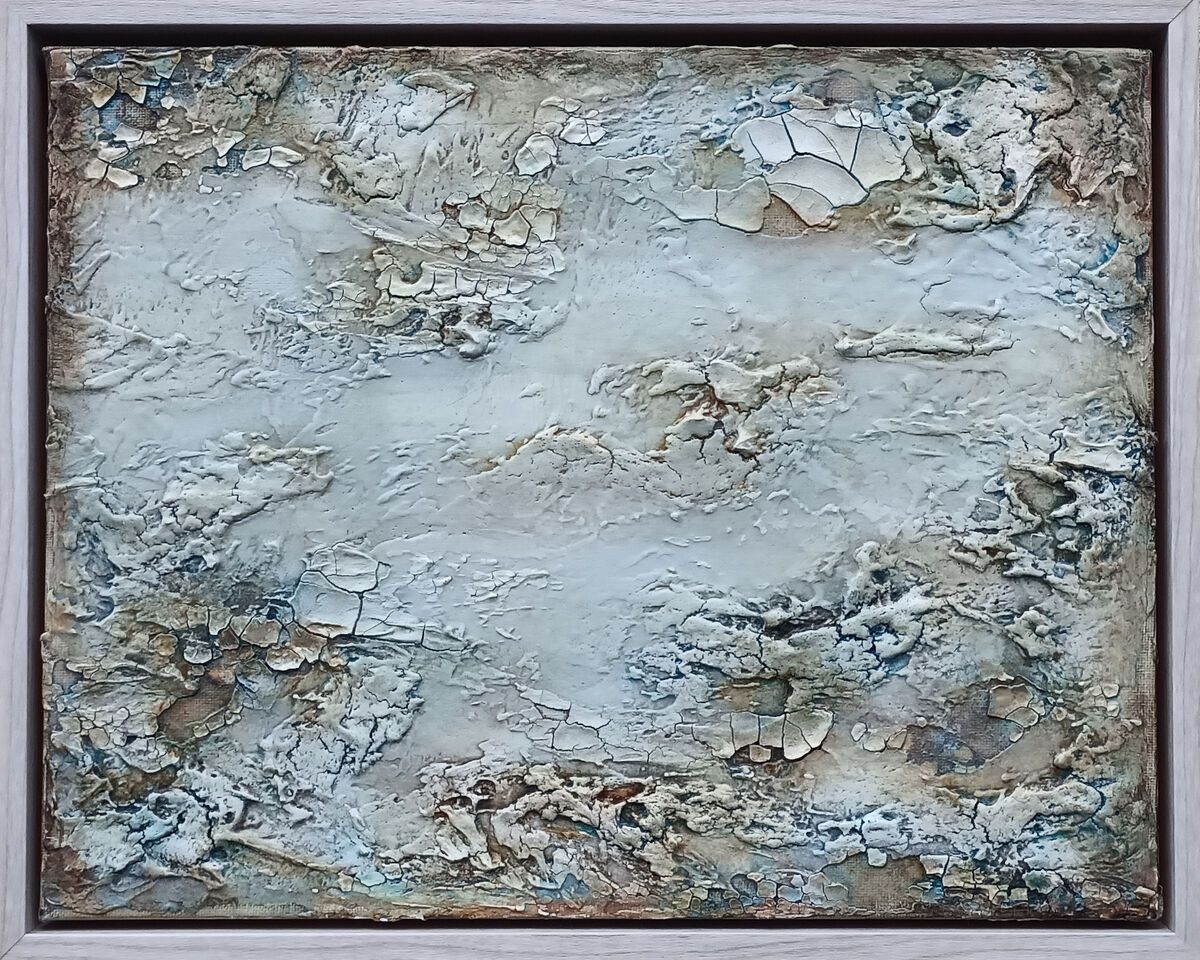 In Entropic Waters, the surface becomes a tide-worn map of dissolution and flow. Pale mineral tones and broken, crust-like textures evoke water’s slow undoing of matter, entropy as a natural law. The work feels both atmospheric and geological, suspended between sea and stone. It reflects impermanence, erosion, and the quiet poetry of things returning to elemental form.